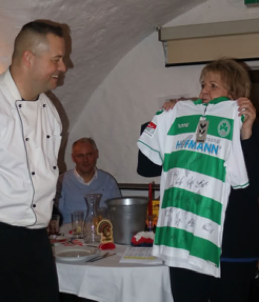 Der Wirt des „Our Place“, Boris Remscheid, erhält ein Sport-Trikot der SpVgg Greuther-Fürth mit Unterschriften aller Spieler des Vereins als Dank für die jahrelange Gastfreundschaft, überreicht von Edith Lindgren, KONTAKT-Outreach.